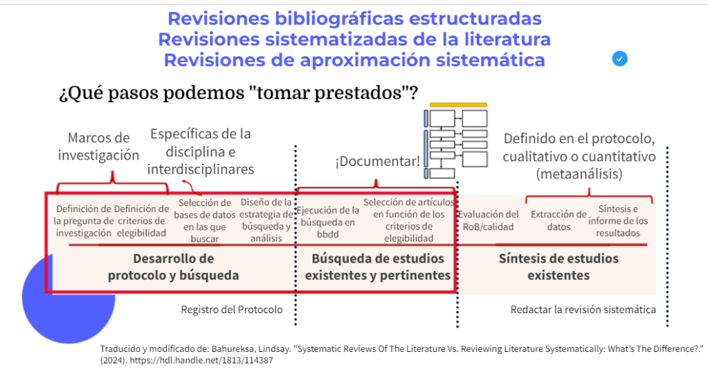 Este tipo de revisión tradicional con algún grado de aproximación sistematizada (Codina, 2024) nos las podemos encontrar como «revisiones bibliográficas estructuradas», «revisiones sistematizadas de la literatura» y «revisiones de aproximación sistemática» («systematic approach», Booth, 2012).