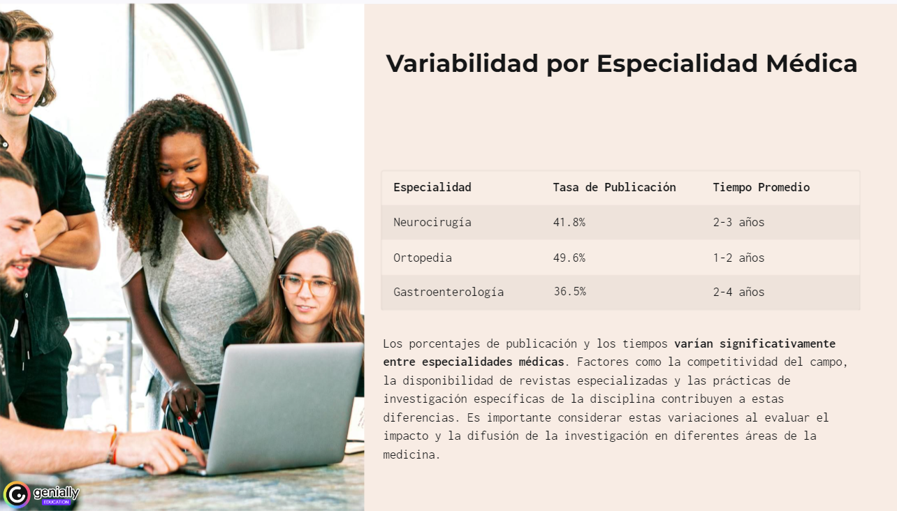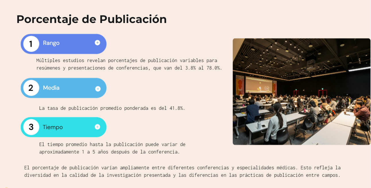 Sólo del 30-54% de las presentaciones orales y resúmenes de conferencias médicas fueron seguidos de publicación en revistas revisadas por pares dentro de 2-5 años, con tiempos de publicación que varían significativamente según la especialidad (2-13).