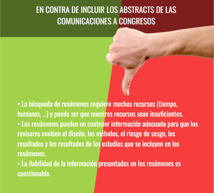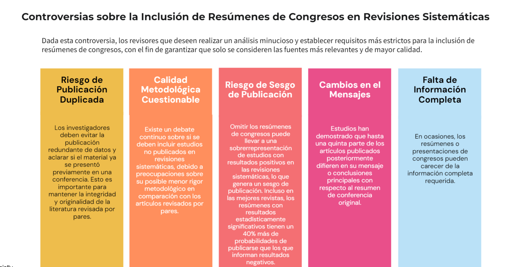 Dada esta controversia, los revisores que deseen realizar un análisis minucioso y establecer requisitos más estrictos para la inclusión de resúmenes de congresos, con el fin de garantizar que solo se consideren las fuentes más relevantes y de mayor calidad. Antes de decidir arbitrariamente incluir o no resúmenes de congresos en una revisión sistemática, Scherer y Saldanha (14) nos dan las pautas que deben considerar los revisores sistemáticos. Nos recomiendan que: