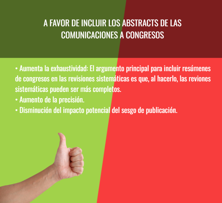 El principal argumento para su inclusión en las revisiones es el sesgo de publicación. Omitir los resúmenes de congresos puede llevar a una sobrerrepresentación de estudios con resultados positivos en las revisiones sistemáticas, lo que genera un sesgo de publicación. Incluso en las mejores revistas, los resúmenes con resultados estadísticamente significativos tienen un 40% más de probabilidades de publicarse que los que informan resultados negativos.