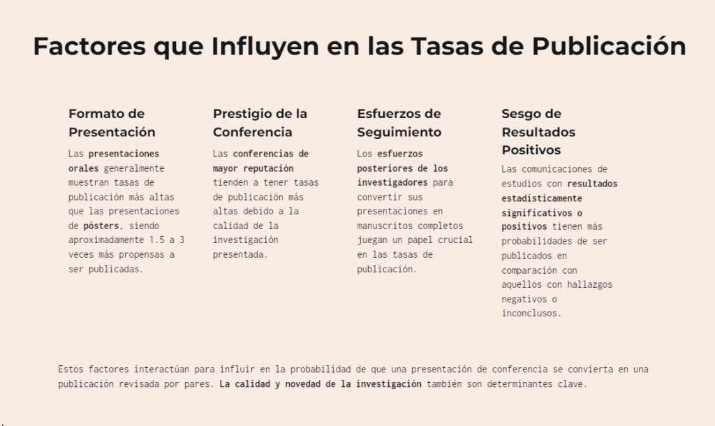 Determinados factores interactúan para influir en la probabilidad de que una presentación de conferencia se convierta en una publicación revisada por pares. La calidad y novedad de la investigación también son determinantes clave.